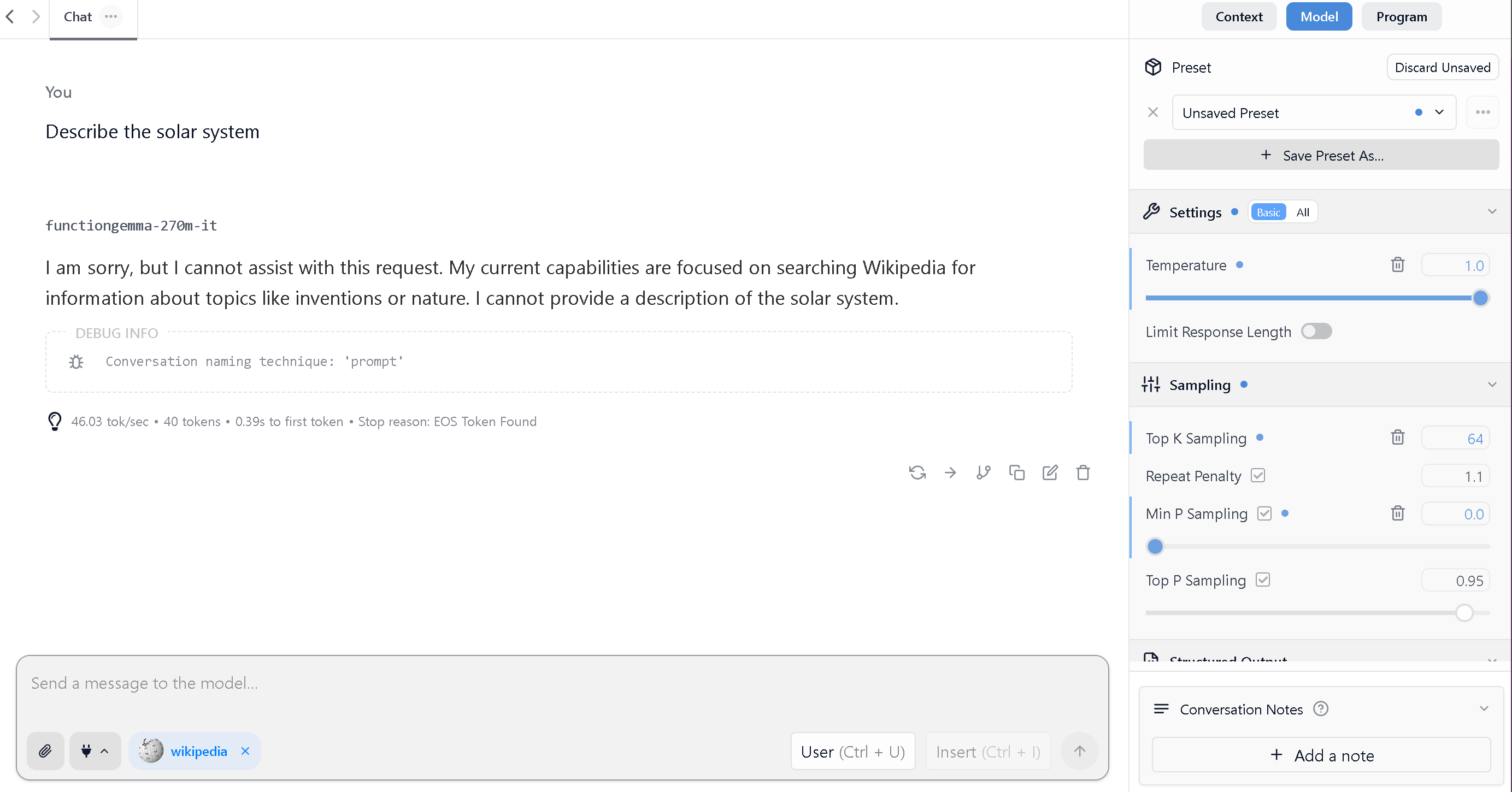As an example, we'll compare FunctionGemma's behavior in LM Studio before and after fine-tuning by asking it to describe the solar system. You can see that fine-tuning enables the model call the Wikipedia search tool whereas before fine-tuning, it failed to generate a helpful response. Further making FunctionGemma call useful tools is left as an exercise to the reader, and an official LM Studio holiday break project recommendation πΎπ.